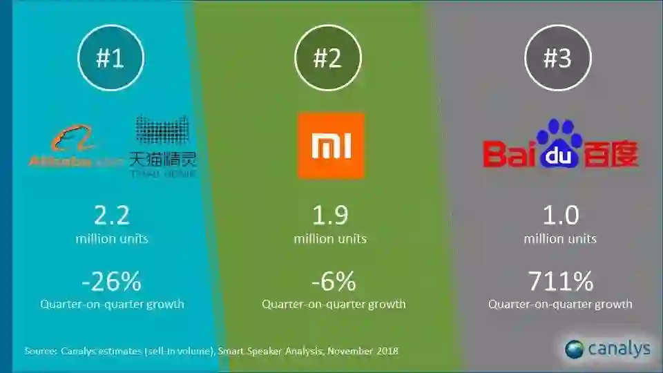 在这张图表中,其实最受关注的应该是百度。因为在2018年一季度,百度因为渡鸦系列产品销量惨淡(销量可能只有1-3万台),还属于智能音箱领域排不上号选手。随后百度将智能音箱在2018年上升到集团战略层面,甚至将智能音箱列为百度在人工智能时代的落地产品,最后挤进了全球智能音箱销量排名。