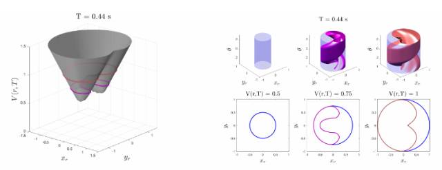 图4和图5:在左边,我们展示了价值函数的初始和根据微分博弈演化过程。在右边展示了价值函数的3D和2D切片。 每个切片可以被认为是“候选跟踪误差界”。随着时间的推移,这些界限中的一些将变得不可行。 但收敛的价值函数的最小不变水平集为我们提供了可行的跟踪误差界。
