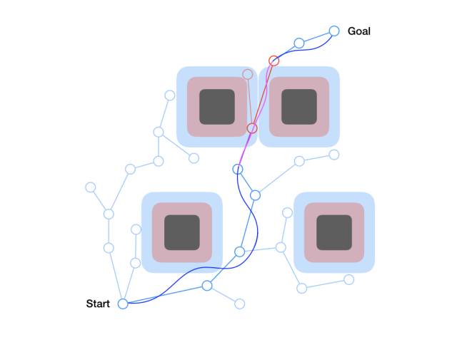 图2: FaSTrack背后的想法是使用简化模型(蓝色),预先计算跟踪误差界限,以捕捉由于模型不匹配和环境干扰(如风)导致的轨迹的潜在偏差,并误差反馈控制使误差保持在界限内。 我们可以通过增加跟踪误差界限来扩大障碍,这保证了我们的动态系统(红色)保持安全。 扩大障碍物的边界在机器人领域并不是一个新概念,但是通过使用我们的跟踪误差界限,我们可以考虑到系统动力学和其他干扰。