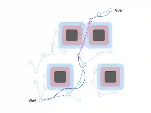 为了实时高效地完成元规划,我们利用一个传统RRT算法的修改版本。通常,RRT通过在状态空间中采样数据点并用线段连接来形成一个以起点为根的树。在我们的方案中,我们利用独立规划器生成的轨迹来替换线段。为了找到目标点最近的路径,我们希望能够移动得更快点,所以优先尝试移动快速的规划器,当且仅当在这类规划失败的情况下才切换到慢的规划器。