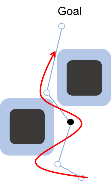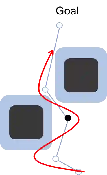另一方面,像快速探索随机树(RRT)和模型预测控制(MPC)等几何运动规划器可以通过使用简化的系统动力学模型在较短的预测时间域内进行实时规划。虽然这使得我们可以执行实时的运动规划,但是由此产生的轨迹可能过于简化,导致不可避免的碰撞,甚至可能是不可行的(见图1)。 例如,想象一下骑自行车,跟随行人追踪的路径。 这条路通向一棵树,然后在最后一秒转90度。你不能让你的自行车如此急转弯,而是最终撞上树。 通常,机器人专家通过假设障碍比规划中的实际情况略大,从而缓解了这个问题。 这大大提高了不崩溃的机会,但仍然不提供保证,并可能导致意外的碰撞。