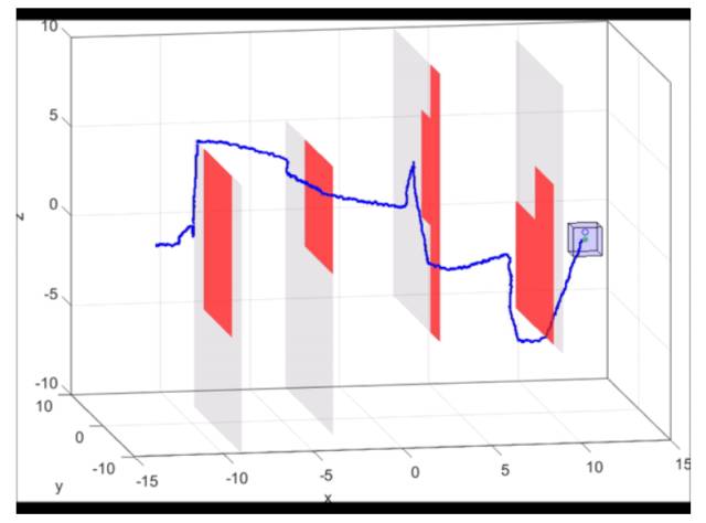 图6. 利用MATLAB仿真了10D接近悬停的四旋翼模型(蓝线) “追”一个使用RRT进行规划的3D规划模型(绿点)。当新的障碍被发现时(变红),RRT计划了一条新的通向目标的道路。根据规划器与系统之间的相对状态,利用查找表得到最优控制。即使RRT规划器要求一个急转弯,我们也能保证跟踪误差不超出误差界(蓝框)。