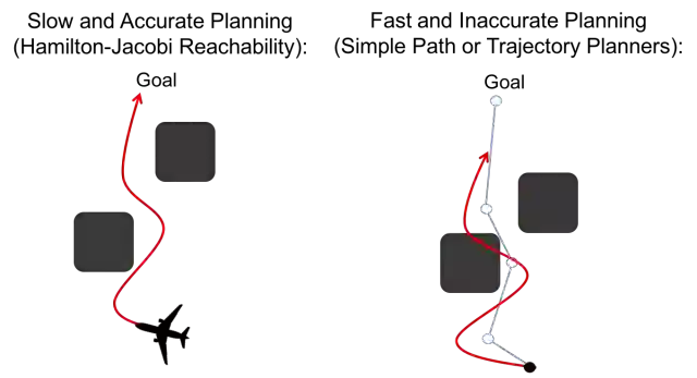 图1:在左边,在左边我们有一个高维的飞机通过一个障碍门到达一个目标。计算最优安全轨迹是一个缓慢的、有时棘手的任务,重新规划几乎是不可能的。在右边,我们简化了车辆的模型(在这个例子中,假设它在目标点之间直线移动)。这让我们可以快速地规划,但是当我们执行规划的轨迹时,我们可能会发现它实际上不能正确地沿着路径走,最后会崩溃。