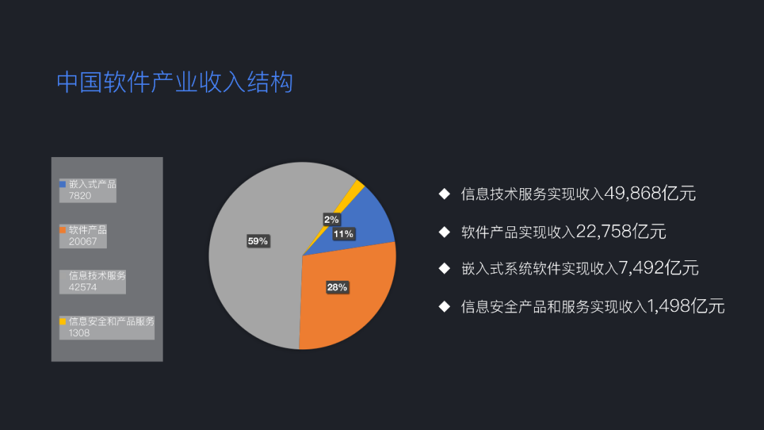 软件产业的利润也是非常可观的,2020 年的利润达到了 10676 亿元,同比增长 7.8%,这个增速也是很高的。那么中国软件产业的结构是什么呢?就在这 8 万亿里面,信息技术服务占了大头,将近 60%,剩余是软件产品,是 2.2 万亿,嵌入式 7400 亿,还有信息安全产品 1400 亿,这是整个分布,从这个分布我们也可以看到一个特点,就是我国的软件产品还是比较弱的。