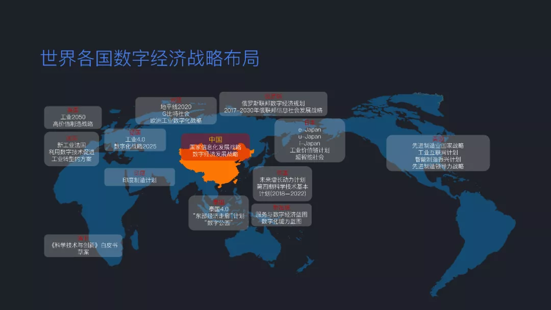 世界各国对数字经济非常重视,每个国家都推出了自己有关数字经济的发展规划。从这张图上可以看到,中间是我们中国的数字经济的一些规划,可能大家耳熟能详的就是德国提出了一个工业 4.0,这个在全世界是知名度非常高的。