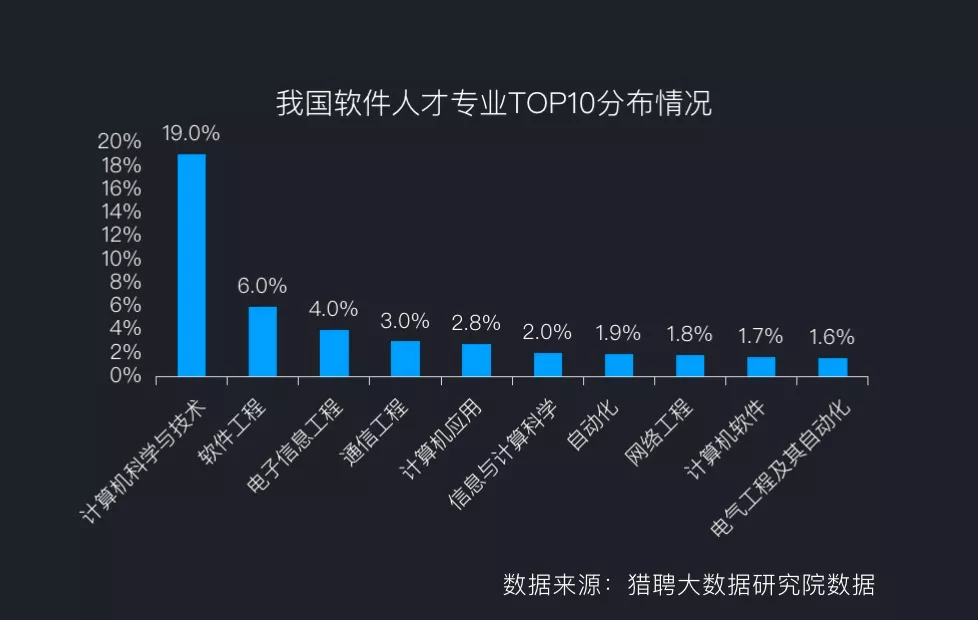 其他的一些新的专业占比较少,人工智能也是近几年才发展起来的,所以人工智能的人才也是非常缺的,有一个统计显示人工智能的从业人员有可能达到 500 万,还有像大数据、区块链等一些新的专业人才缺口也非常大。