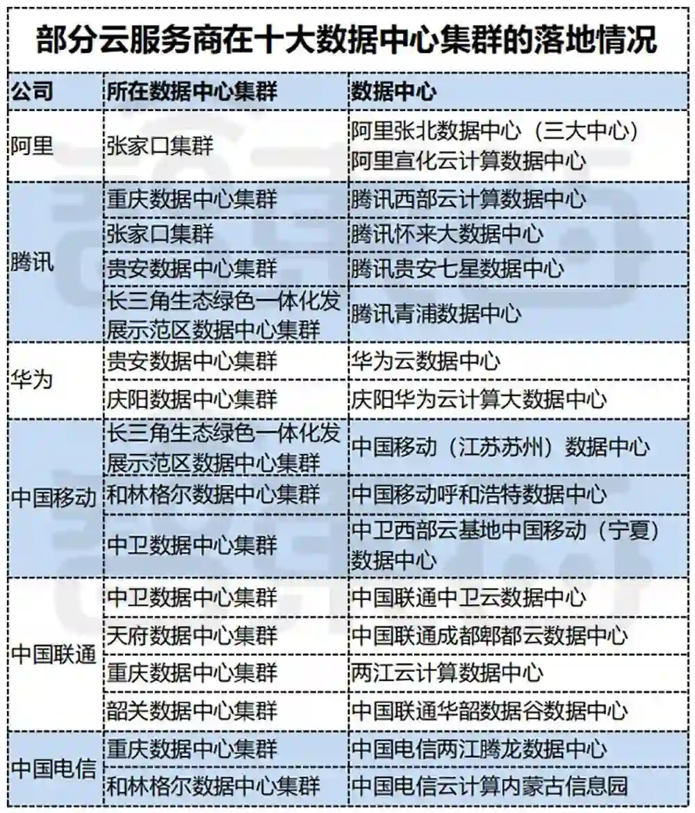 当把物理边界锁定到张家口、中卫、和林格尔等十大集群,我们发现这里几乎成了阿里、腾讯、华为三大云服务商的主战场。
