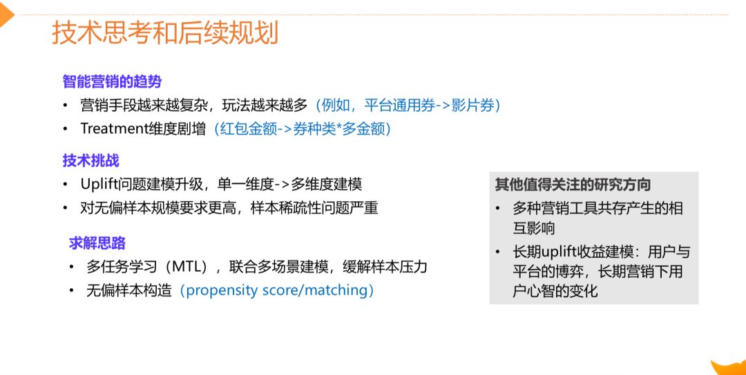 ❷ 我们之前uplift model建模更多考虑的是单次或者短期用户行为的增益,但实际上的营销往往是常态化或持续化的,用户的心智可能会不断发生变化,如何去建模长期的uplift也值得进一步去探讨。