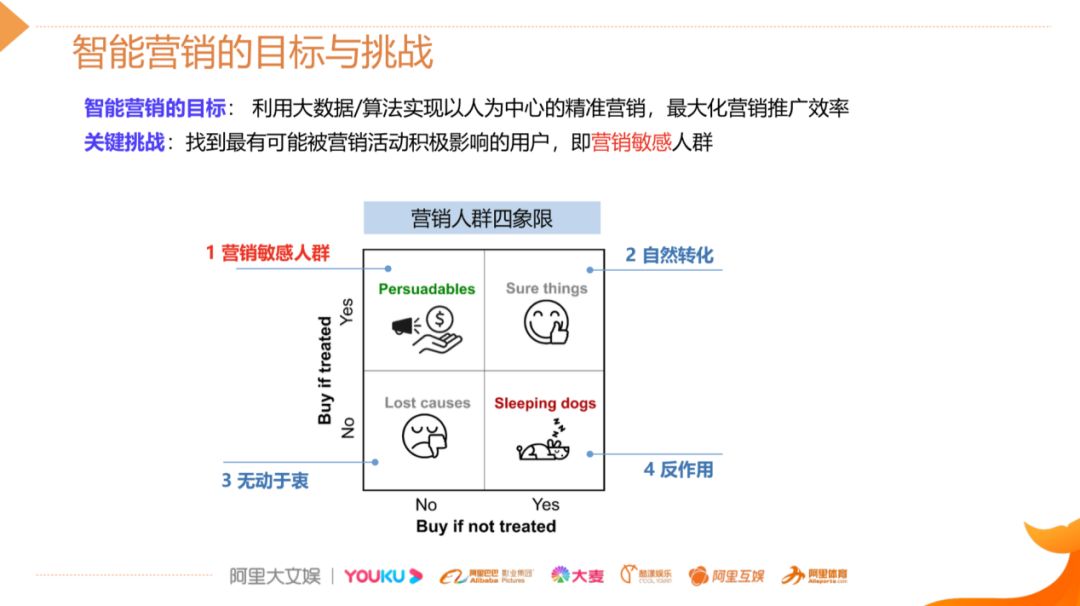 导读:随着移动互联网和人工智能技术的发展,智能化营销正渗透到各行各业。如何衡量和预测营销干预带来的"增量提升",而不把营销预算浪费在"本来就会转化"的那部分人身上,成为智能营销算法最重要的挑战。我们以Uplift Model为基础,构建营销增益预测模型,帮助商家锁定营销敏感人群,驱动收益模拟测算和投放策略制定,促成营销推广效率的最大化。本文将分享营销增益模型的原理和常见的建模及评估方法,并以淘票票智能票补为例介绍Uplift Model技术的实践经验。