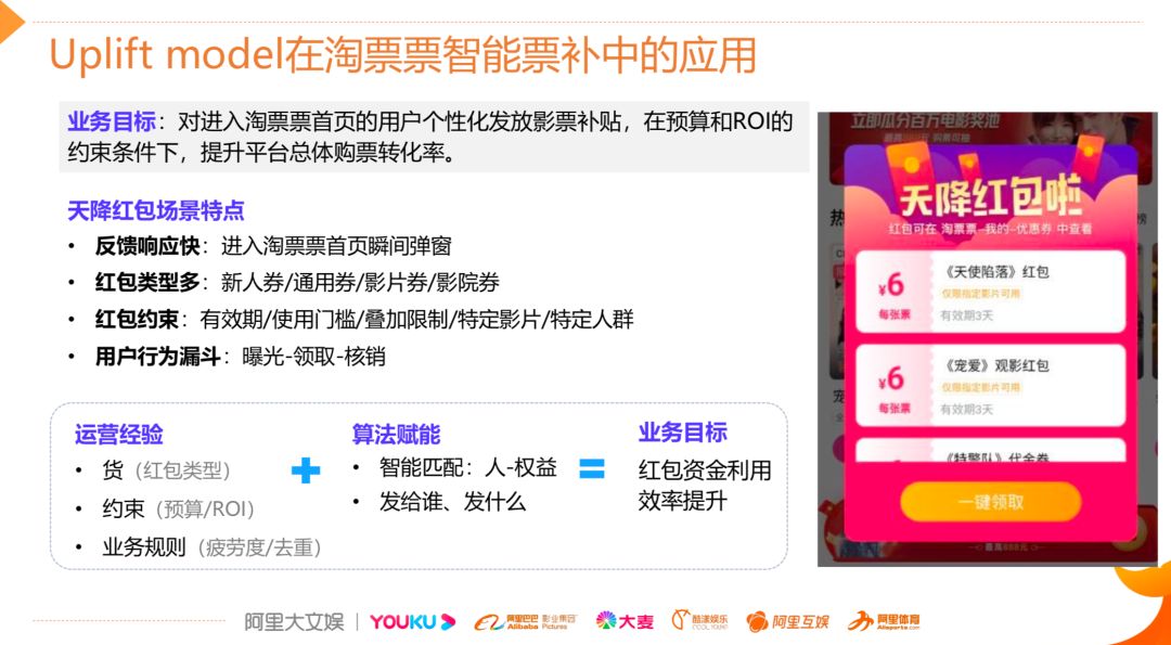 下面以淘票票实际场景为例,来说明uplift model如何在实际场景中进行应用。该项目的目标是希望对进入到首页的用户个性化地发送红包,实现在预算和ROI的双重约束下提升平台总体购票转化率。我们的权益就是首页的红包,红包的使用规则、红包类型、预算和交互样式由产品运营设计,算法的作用是实现人和权益的精准匹配,我们需要确定应该给哪些用户发放以及发放哪种类型的权益。