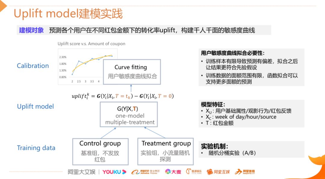 收集到样本之后可以进行建模,考虑到业务迭代的周期,我们使用的是前面介绍的One Model的差分响应模型,特征层面,除了user维度的基础属性,还有历史的观影行为,以及历史红包的反馈,同时也会引入线上实时的环境特征,最重要的是跟营销相关的特征T,目前T代表的是红包的金额。