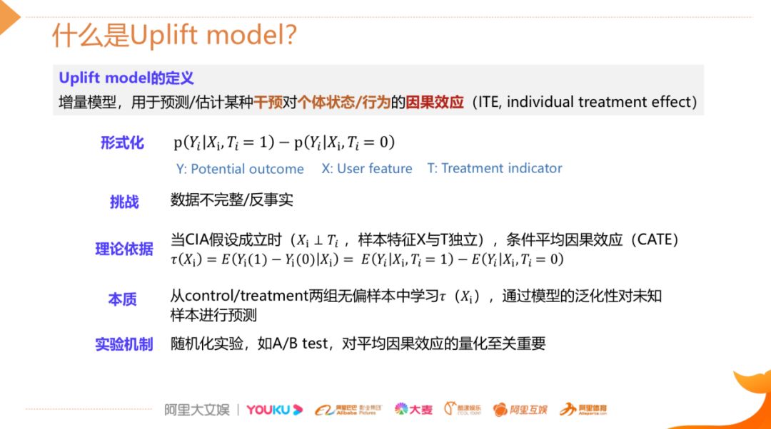 Uplift Model是一个增量模型,目的是预测某种干预对于个体状态或行为的因果效应。在数学上可以表达为两个条件概率的差值形式,如下图所示: