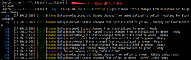 通过更改 kibana.yml 配置文件内容,用来连接正确的 Elasticsearch 服务地址,通常只需要配置 elasticsearch.url 属性即可,请见下图的第一个图。配置完成后,执行【bin/kibana &】命令启用 Kibana 服务,请见下图的第二个图。最后就可以在浏览器中打开 Kibana 管理页面(访问地址:http://139.198.13.12:4800/)来查看日志。