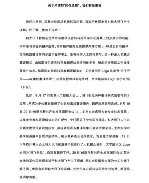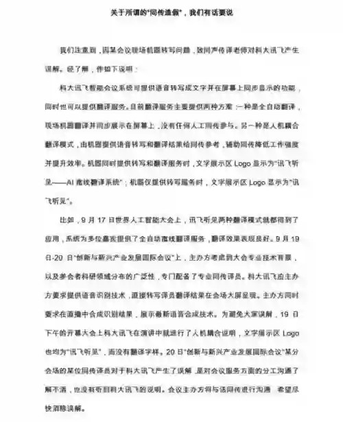【TechWeb】昨天一篇质疑科大讯飞“AI同传”造假的文章引起了广泛关注。一位同声传译员在知乎爆料称,在近期举办的一场国际会议上,科大讯飞的AI同声传译其实就是“复读”人工翻译的结果,而且“复读”并不准确,错误频出,并打上了“讯飞听见”logo。文章表示压根没有什么人工智能翻译,只是剽窃同传员的语句。今天早上,科大讯飞发表了一篇名为《“关于所谓的“同传造假”,我们有话要说》的声明。