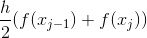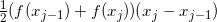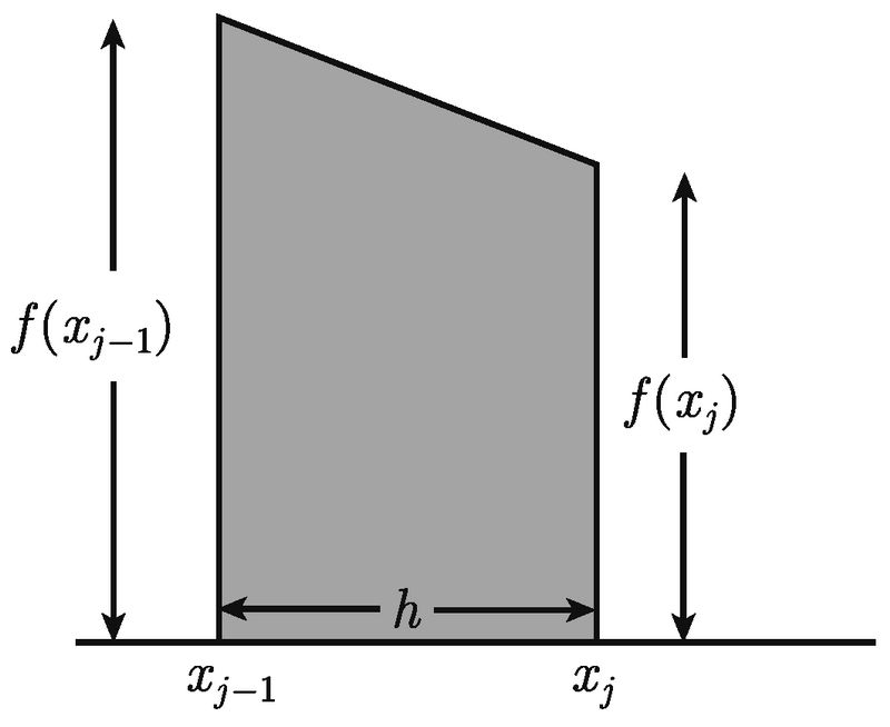 由于有两条边是平行的, 故该条纹是一个梯形. 底边长是 (xj - xj-1) 单位, 而平行的边的高度为 f (xj-1) 单位和 f (xj) 单位. 根据梯形面积公式, 这个梯形条纹的面积是