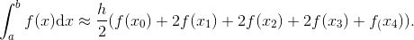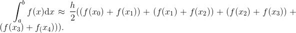 这意味着, 我们可以将很多项合并. 特别地, 除了 x0 和 xn 之外, 形如 f (xj) 的每一项都被用到两次. 例如 n = 4 时, 我们有