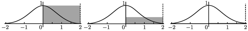 所有这一切看起来都很抽象. 我们来看看它在上例中是如何起作用的吧. 我们要从 0 到 2 积分, 因此需要区间 [0, 2] 上的一个划分. 该区间上最简单的划分就是这个区间 [0, 2], 这相当于选择 n = 1、x0 = 0 及 x1 = 2. 我们只需要在 [0, 2] 内选取 c1. 求出的近似很大程度上依赖于这个选取! 例如, 如果选取 c1 = 0、c1 = 1 或 c1 = 2, 那么近似就会分别对应图 B-2 所示区域的面积.
