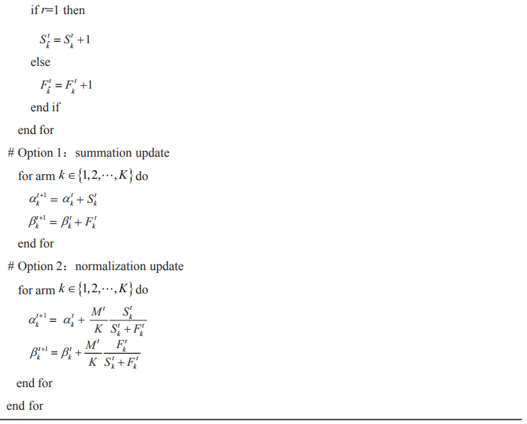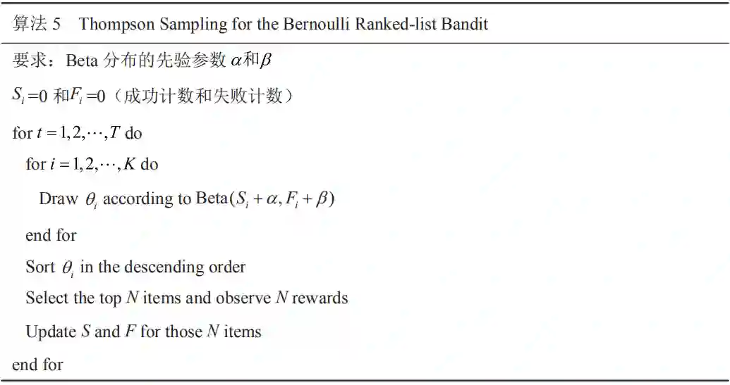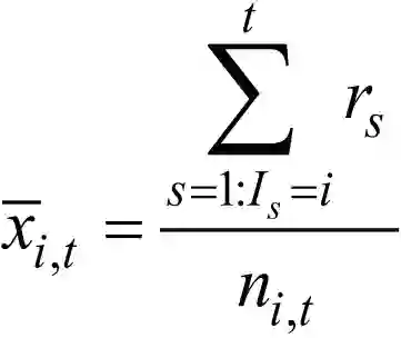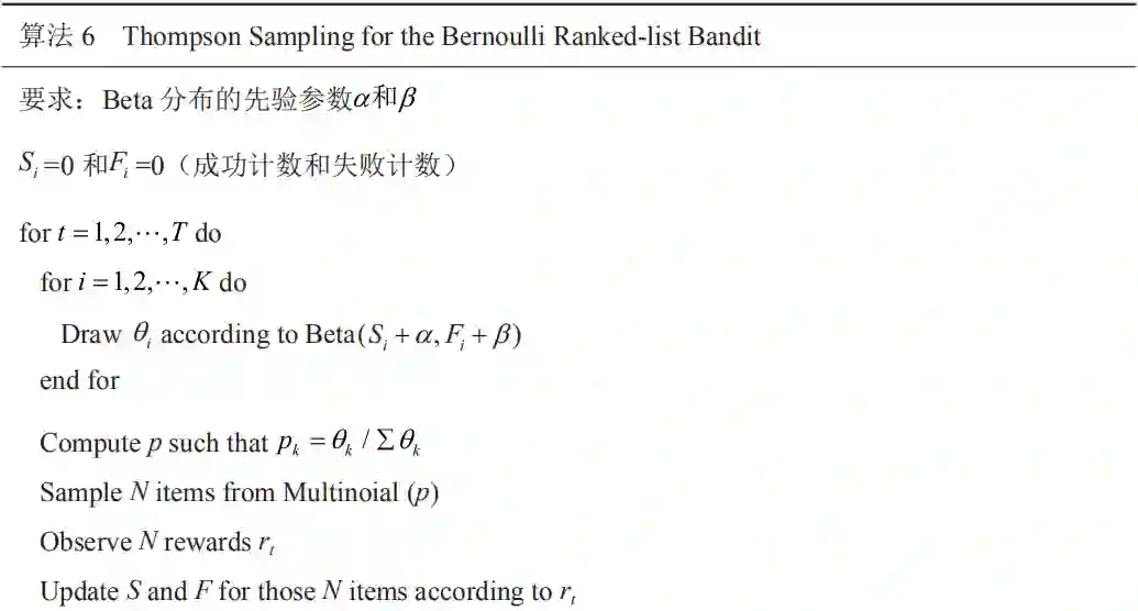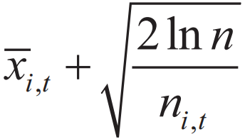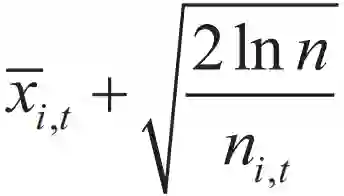 为第 i 个臂到当前时刻 t 的平均回报,称为利用项 ( Exploitation Term );后一项为置信度,即对第一项的回报估计的确信程度,称为探索项 ( Exploration Term ),rs 为在 s 时刻观察到的收益,ni,t 为第 i 个臂到当前时刻 t 的选择次数,n 为总选择次数。平衡选择已有较好表现的物品和具有潜在贡献的物品。如果物品的置信区间很宽 ( 被选次数很少,且不确定 ),那么它会倾向于被多次选择,即探索,这是算法冒风险的部分。如果物品的置信区间很窄 ( 备选次数很多,且能确定其好坏 ),那么均值大的倾向于被多次选择,即利用,这是算法保守稳妥的部分。