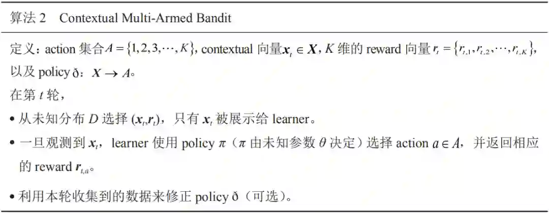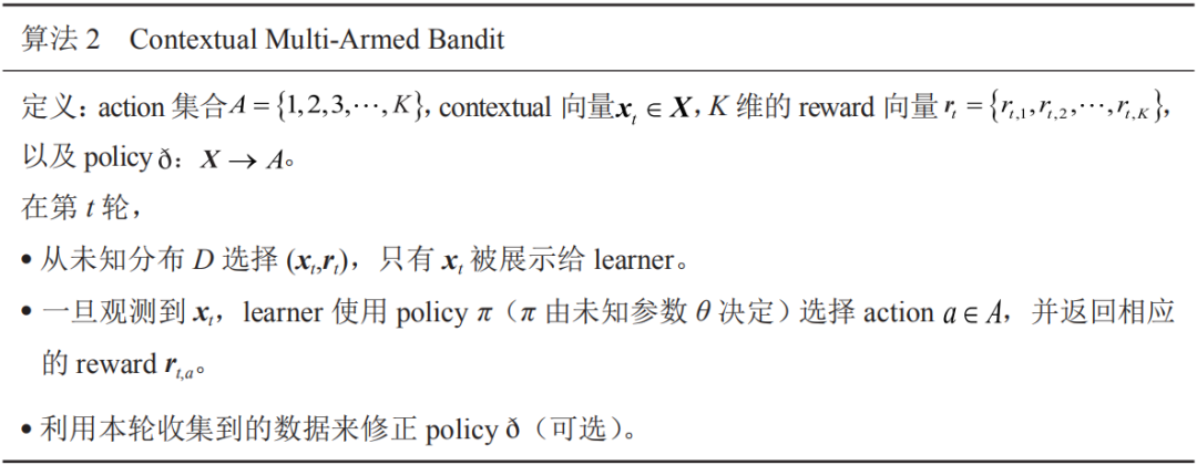 每个臂包含特定的随时间变化的上下文特征 xt,并且其回报 rt 和上下文特征 xt 直接相关,即存在一个函数 f,使得 rt=f(xt),其中 xt 为实际应用中抽象出的辅助选择每个臂的特征。根据不同的互联网推荐系统场景可以产生不同的用户特征和物品特征,不同的有关函数 f 的假设会得到不同的模型,选择最大化期望回报策略: