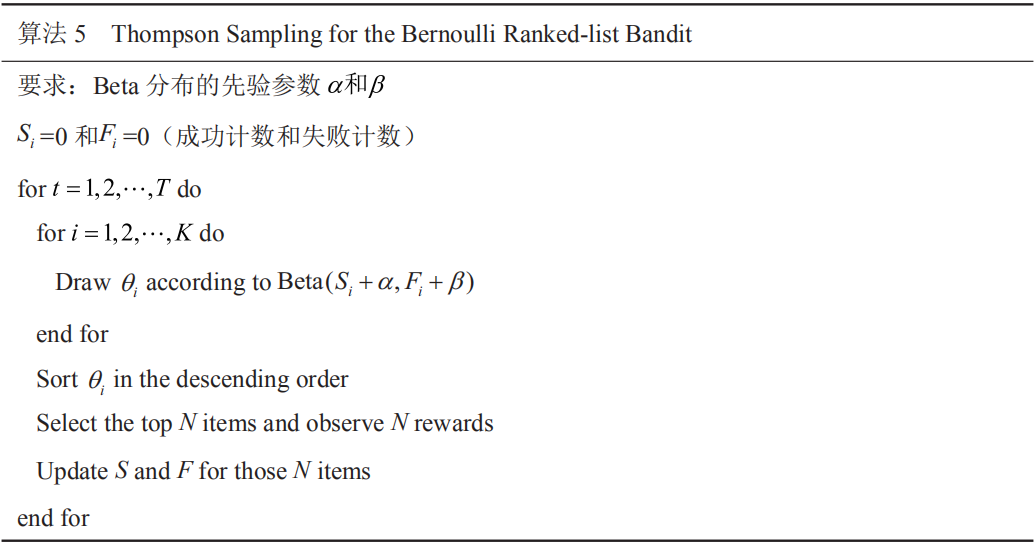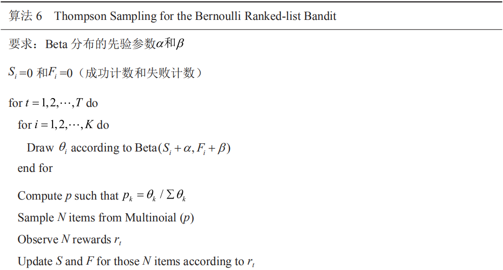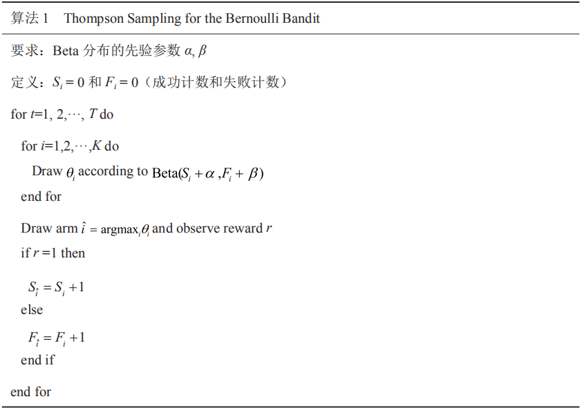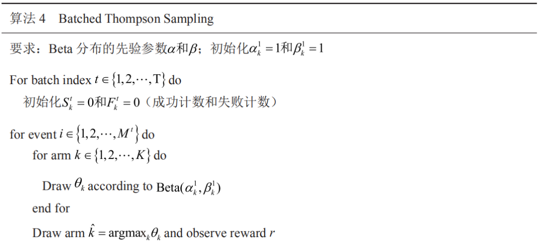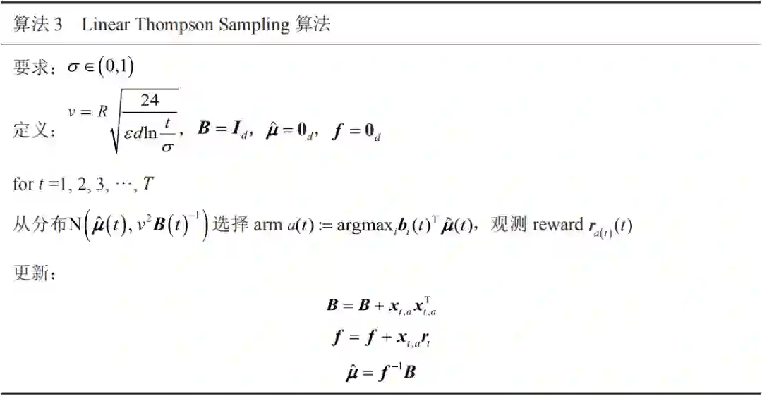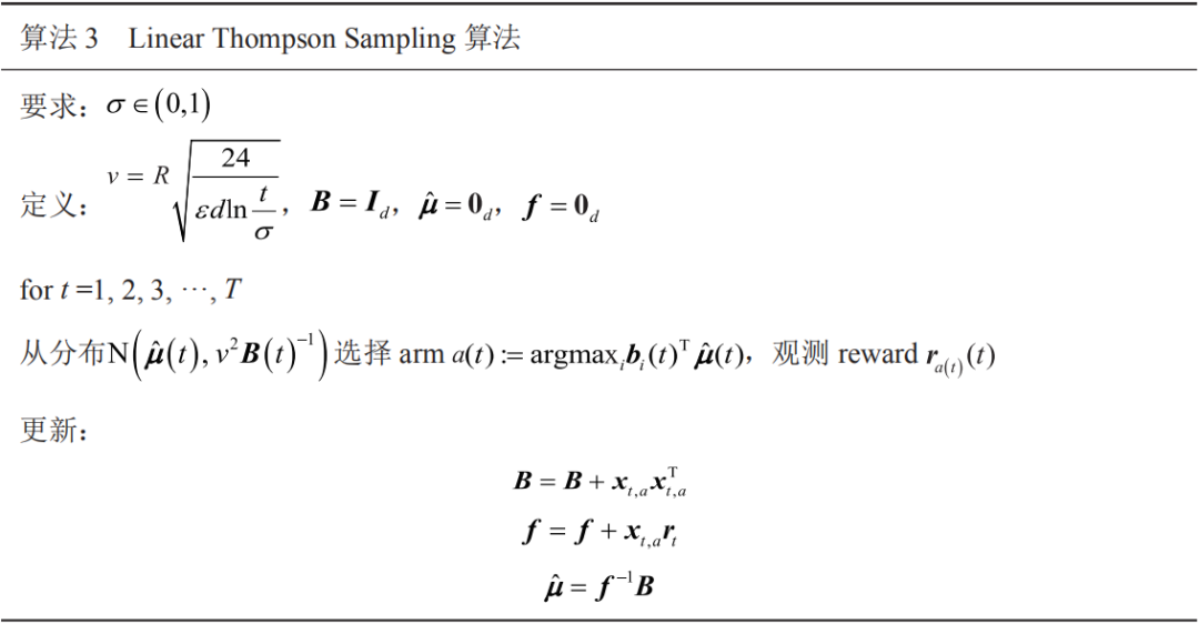 其中 Ex,r 为期望。对应 Context-free 的 Thompson Sampling 算法,算法3给出一种相应的 contextual bandit 算法:Linear Thompson Sampling 算法。