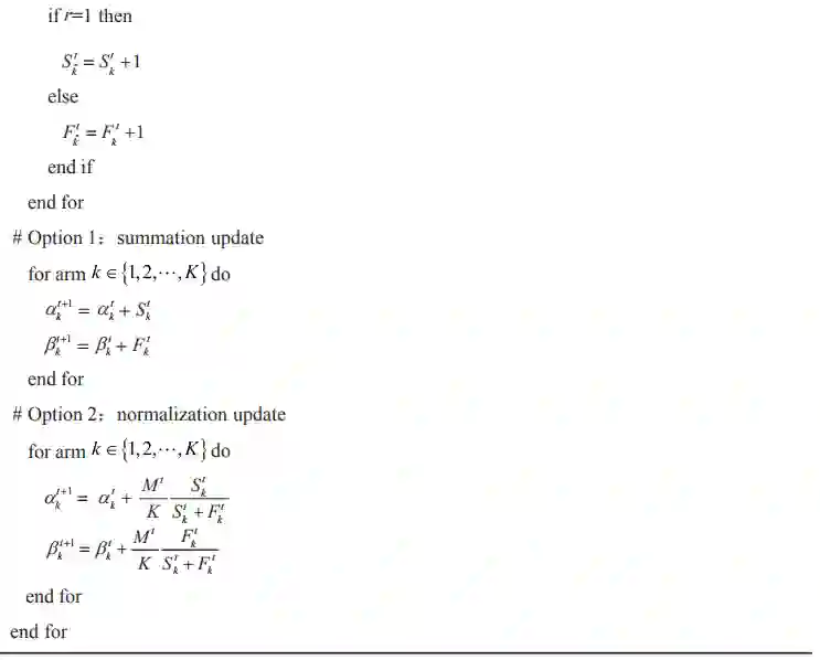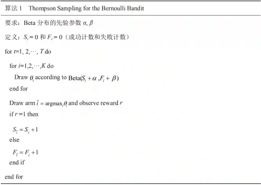 汤姆森取样是一种通过贝叶斯后验采样 ( Bayesian Posterior Sampling ) 进行探索与利用的方法。采用贝叶斯思想,对奖赏分布的参数假设一个先验分布,根据观测到的奖赏更新后验分布,根据后验分布选择臂。