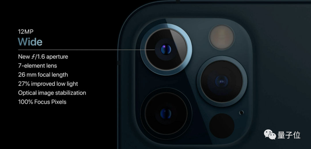 摄像头方面,iPhone 12 Pro是三摄(广角、超广角、长焦)+LiDAR,全新 7P 镜片的广角,f/1.6,52mm 焦距长焦,整套系统可提供四倍光学变焦。