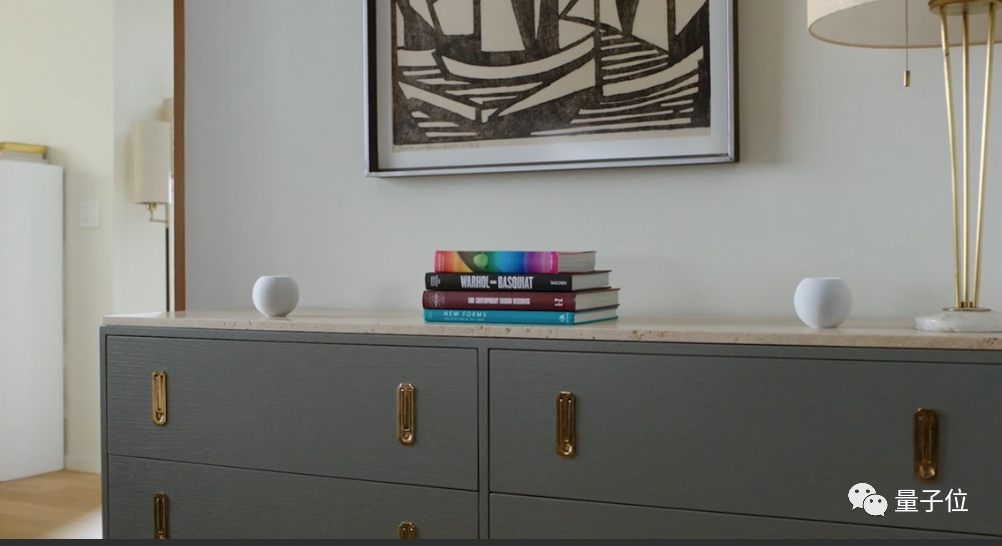 多个HomePod迷你扬声器还可以同步播放音乐,并且放在同一房间时,可以“智能”地创建立体声配对,像这样,一边放一个就行: