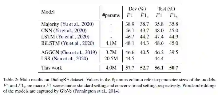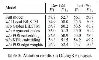 为了理解模型组件的影响,论文使用模型在 DialogRE 数据集上执行 ablation study,结果见表 3。
