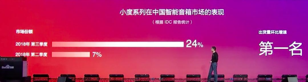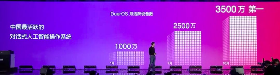 后来登场演讲的百度智能生活事业群组总经理景鲲,给出了几个数据:“2018 年 10 月,DuerOS 月活跃设备数为 3500 万。据 IDC 统计,DuerOS 设备是中国智能音箱市场第三季度出货量第一名。”作为参考,小米小爱同学今年 8 月的月活设备数为 3000 万。
