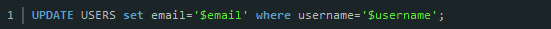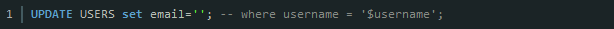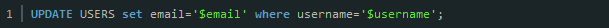 很明显,这段代码存在SQL注入漏洞,但它本身并不能对系统造成什么影响(仅是泄露数据),所以我们案例中的新手渗透工程师可以大胆地随意注入’ or 1=1 --。但如果是下面这段查询代码呢?这段代码用于更新用户的电子邮箱: