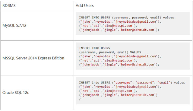 让我们来重现一下常见的数据库环境,来测试我们的注入。我们先安装三款企业常用的关系数据库管理系统(RDBMS),MySQL、MSSQL、和Oracle,并在它们中各创建一个储存用户的表(USERS),如下。
