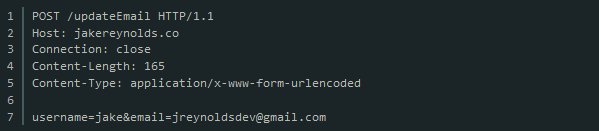 从这个HTTP请求的格式和服务端点的名称应该不难推断出服务器需要执行的查询。很明显,这个服务端点的用途是更新用户的电邮,那必然会执行UPDATE查询。我们的目标就是找到既可证明SQL注入漏洞存在,又不会造成破坏的注入载荷,并用其进行测试。