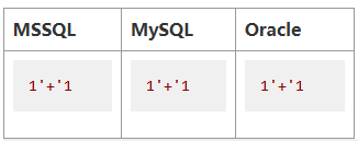 如之前所述,在MSSQL中“+”运算符被用于串联字符串和加法运算,而在 MySQL和Oracle中它只被用于加法运算。也就是说,在MSSQL中,表达式‘1’+‘1’ 会被评估为‘11’,而在MySQL和Oracle中它则会被评估为‘2’。所以,以下载荷便可通用于测试全三种数据库系统: