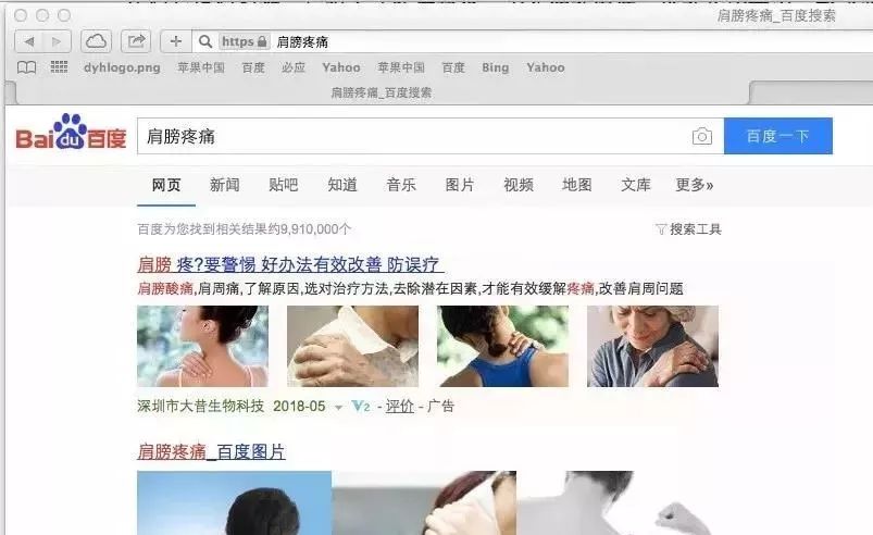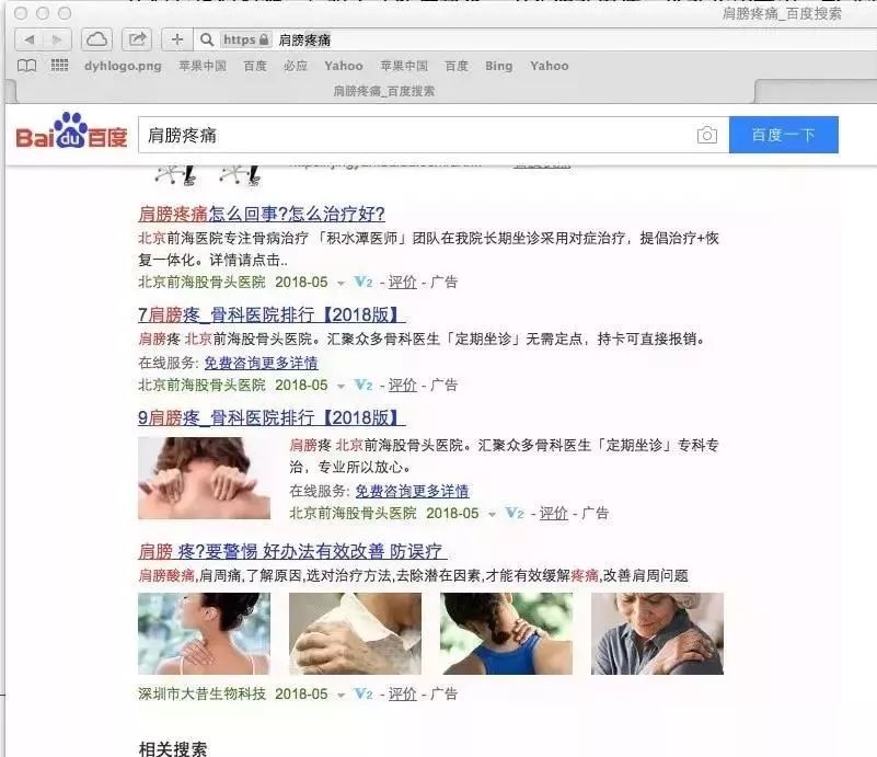 新京报记者5月17日通过百度搜索“肩膀疼痛”,在首页搜索中,前两项搜索结果均为推广内容,分别为来自某民营医院和生物科技公司的推广,且标有“广告”字样。以“胃疼”为关键词进行搜索,首页前两项搜索同样出现标有“广告”字样的推广内容,分别来自两家民营医院。