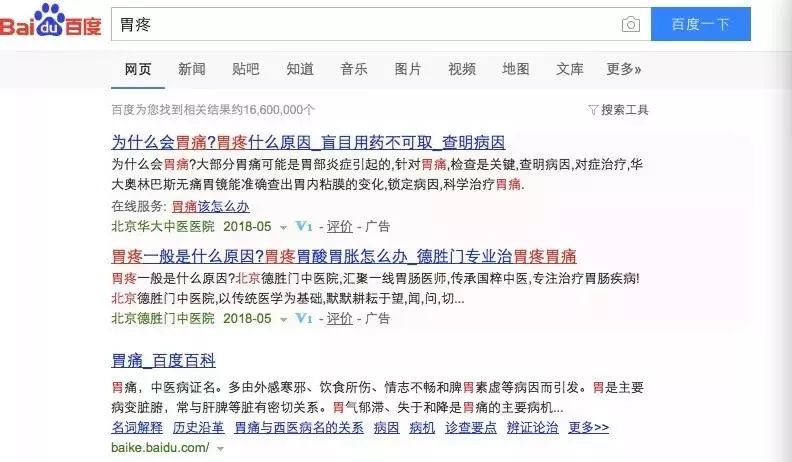 疾病搜索结果中的置顶推广内容也是百度2016年5月对外宣布完成整改的重要内容。彼时,为了进一步改善信息呈现形式,百度曾撤除了大量疾病搜索结果页面中置顶的推广内容,但如今这种情况有卷土重来之势。