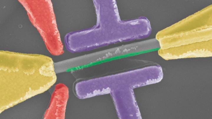 这是物理学家用来发现Majorana粒子最清晰信号的装置。中间的灰线是纳米线,绿色区域是超导铝条。Credit: Hao Zhang/QuTech