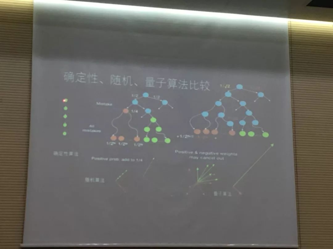 量子算法也会分叉,但分叉的时候系数可以是负数或正数,红的节点叠加起来形成的算法错误的份量可以很小,并可以互相取消。而绿的向量都指向相同的方向,之后就互相叠加,造成一个非常强的信号,因为权重可负可正,所以会引起干涉,这是量子计算最重要、跟经典计算最不一样的地方。