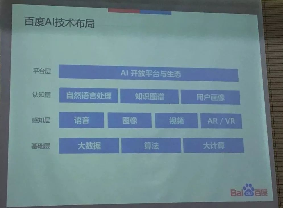 百度在这次人工智能浪潮中布局非常早,AI技术从基础层(大数据、算法、大计算)、感知层(语音、图像、视频、AR/VR)、认知层(自然语言处理、知识图谱、用户画像)和平台层(AI开放平台与生态)四个层面布局。