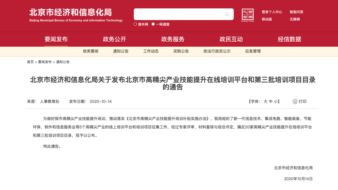 入选北京市高精尖产业技能提升在线培训平台 —— 北京市经济和信息化局