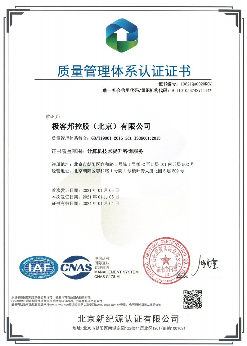 ISO9001用于证实组织具有提供满足顾客要求和使用法规要求的产品的能力。凡是通过认证的企业,意味着在各项管理系统整合上已经达到了国际标准,表明企业能持续稳定地向顾客提供预期和满意的合格产品。极客邦控股(北京)有限公司(极客时间母公司)的认证范围为“计算机技术提升咨询服务”。