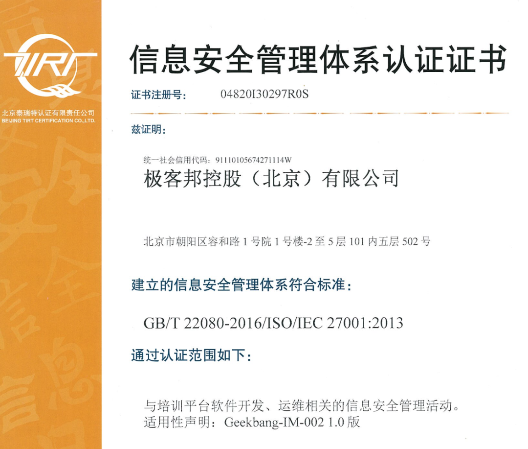 通过了ISO27001认证,代表极客邦科技在信息安全管理上,已建立了一套科学有效的管理体系作为保障。这是在世界上公认解决信息安全的有效方法之一。