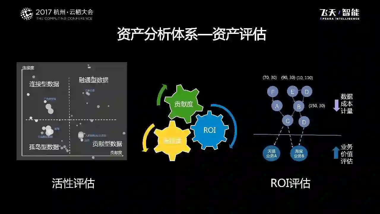 对于资产活性来讲,通过连接度和贡献度可以构建这样的一个模型:对于连接度低且贡献度低的数据,我们把它称为孤岛型数据,对于孤岛型数据要做是跟踪数据的生命周期,实施数据消亡或者减少数据生命周期,同时对这样的数据还需要进行冷备;对于连接度高且贡献度高的这部分数据资产,是价值非常大的,沉淀为阿里巴巴核心数据资产。