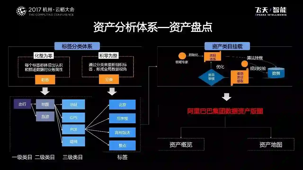 在资产盘点中,我们会有一个标签分类体系,先化整为零:分析每一个数据的业务属性后结合资产分类来重新组织和定义标签;接下来通过领域专家基于业务了解,一起来构建阿里巴巴规范的数据资产类目。