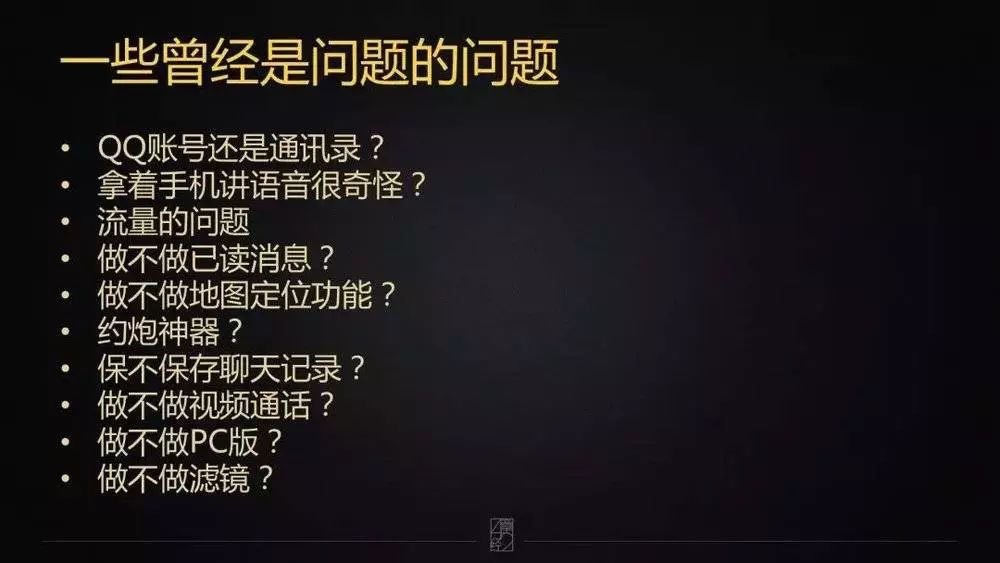 做不做 PC 版?微信大概到了 2013、2014 年才出现 Web 版。它的名字最早不叫 Web 微信,而是叫 “连接键盘”。在它的设计思想里面,电脑端只是帮你更方便打字的一个键盘而已。此外,网页、PC、Mac 版本全都不允许账号密码登录,因为微信账号体系背后有一个哲学:手机就是你,你就是手机,人在手机在,手机在人在。如果手机没了,聊天记录全部清空。如果微信允许 PC 端通过账号密码登录。用户离开电脑,有别人替代你收发微信,怎么办?