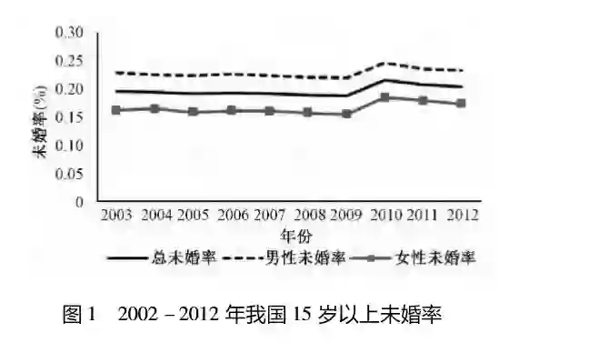 2002年~2012年这10年间,15岁以上未婚人群的数量呈上升趋势。从2002年的22.9%上升至23.38%。