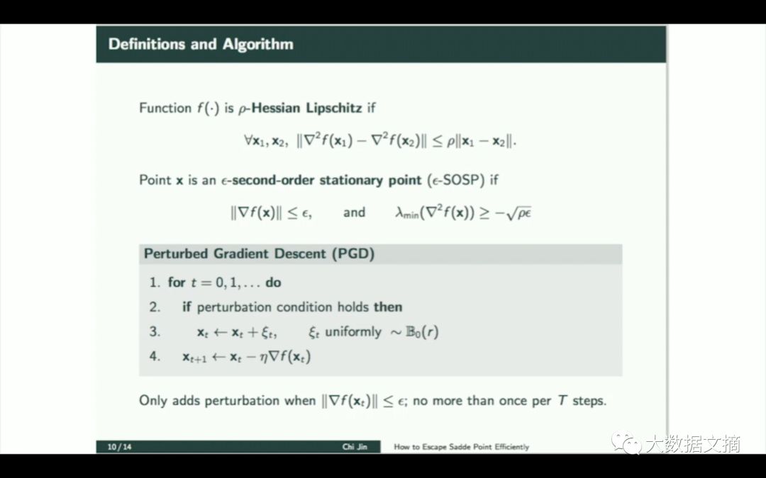 让我们来谈谈这次演讲的主要内容,那么二阶驻点有怎样的性质呢?我们对鞍点尤其感兴趣,但我们同时也很关注局部最小值,我们稍微增加光滑度,可以证明一个定理,我们引入海森-利普希茨性质,很明显二阶驻点是一阶驻点的扩展,这个梯度同样趋近零且不等于零,同时海森矩阵的最小特征值不严格大于等于零。我们给自己放松了一个小区间,从而又得到了一个收敛速度,所以可以看看我们达到二阶驻点速度有多快。这就是我们的算法,我们将其命名为扰动梯度下降。它其实就是一般的梯度下降算法,但是偶尔我们会增加一点随机噪音。