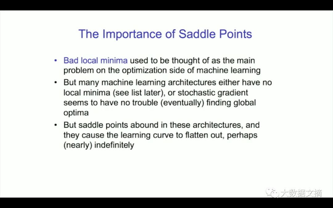 我要讲的是鞍点,以及如何有效地避开它们。你们都知道局部最小值是我们的克星,所以我一直在讨论这个问题,那就是如何避免局部最小值。但问题并不明显,有很多机器学习的问题没有局部最小值。即使你有局部最小值,梯度下降似乎可以轻松回避它们。神经网络如果足够大的话就会有足够的冗余,要做到这一点并不难。达到零就是全局最优解。这就是你们在实践中看到的。也许这并不是真正的问题。如果一个回路的局部最大值不是问题,它的鞍点是剩下需要解决的。
