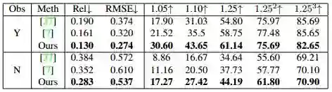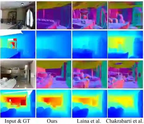 本文提出的方法是比较深度估计设置下的最先进的方法。 我们的方法不仅产生准确的深度值,而且还产生如表面法线中所反映的大尺寸几何结构