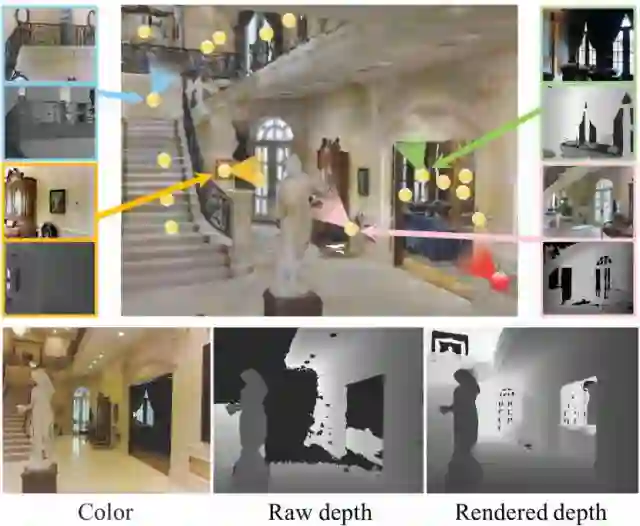 深度修复是从大型室内环境的多视图表面重建计算的。 在此示例中,底部显示了原始颜色和深度通道,其中标记为红点的视点渲染深度。 渲染后的网格(由大图像中的顶点着色)通过组合来自遍布整个场景的各种其他视图(黄色点)的RGB-D图像创建,这些视图在渲染到红点视图时协作填充孔。