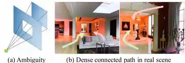 (a)深度不能从曲面法线求解的例子。(b)缺少深度的区域标记为红色。 红色箭头显示不能从表面法线集成深度的路径。 然而,在现实世界的图像中,通过连接相邻像素(沿着地板,天花板等)的许多路径,在这些路径上可以集成深度(绿色箭头)。